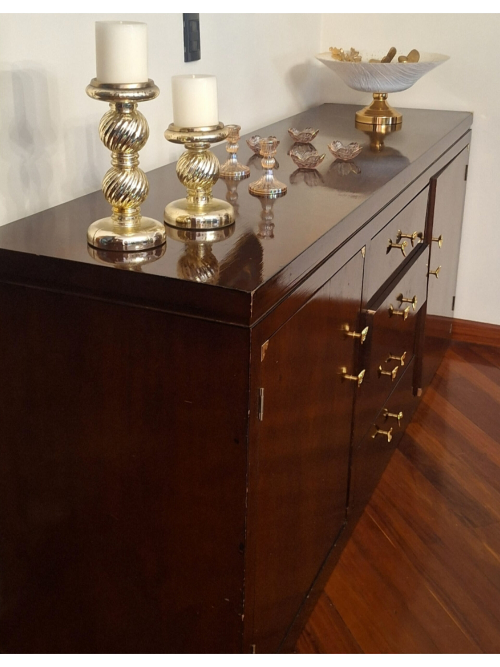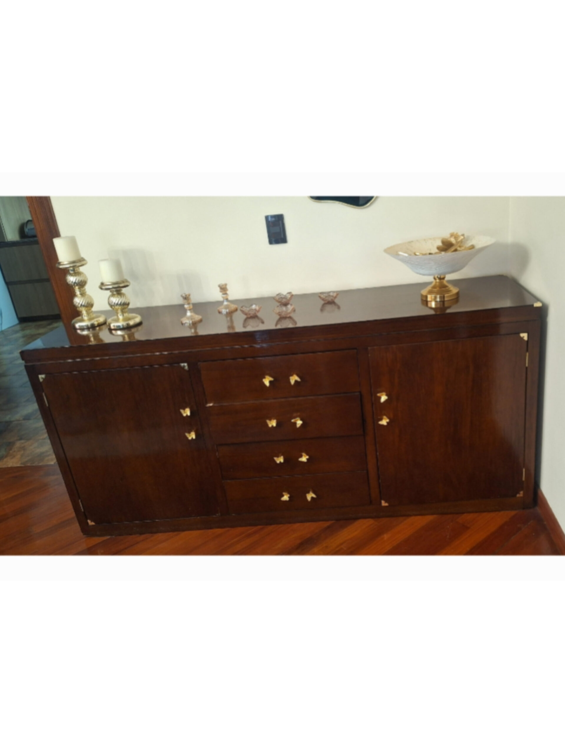 En la parte frontal combina dos puertas laterales —una a cada lado— con un bloque central de cuatro cajones, lo que lo hace muy funcional para almacenar vajilla, mantelería u objetos decorativos. Los herrajes dorados con forma de mariposa son un detalle distintivo: añaden un toque decorativo refinado y ayudan a reforzar su apariencia tradicional y ornamental.