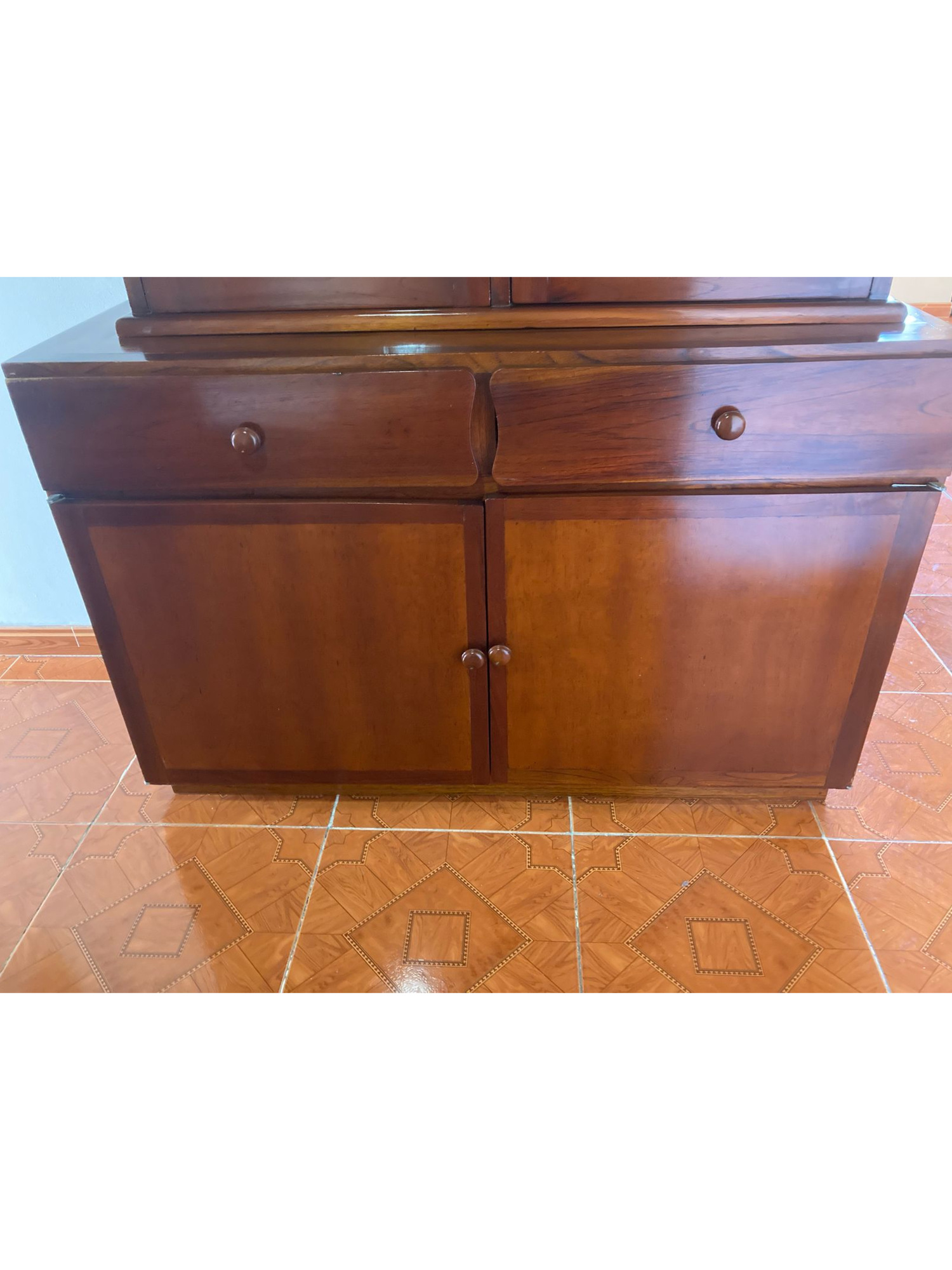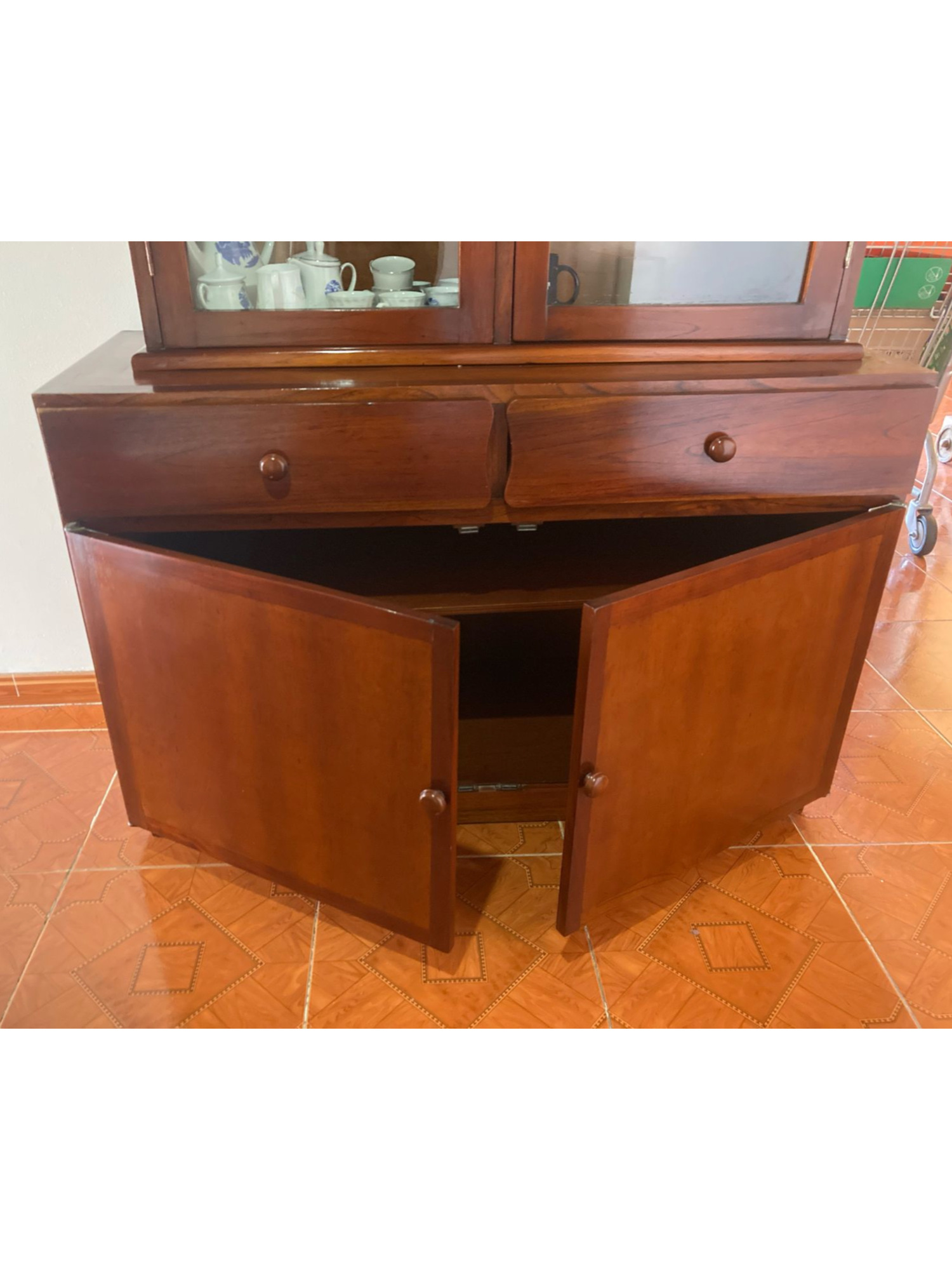 Bifé con vitrina superior integrada, compuesto por dos módulos. La vitrina superior tiene 2 puertas abatibles con paneles de vidrio transparente, marco en madera y repisas interiores visibles para exhibición de vajilla o cristalería. Las manijas de apertura son redondas, en madera, ubicados al centro de cada puerta.