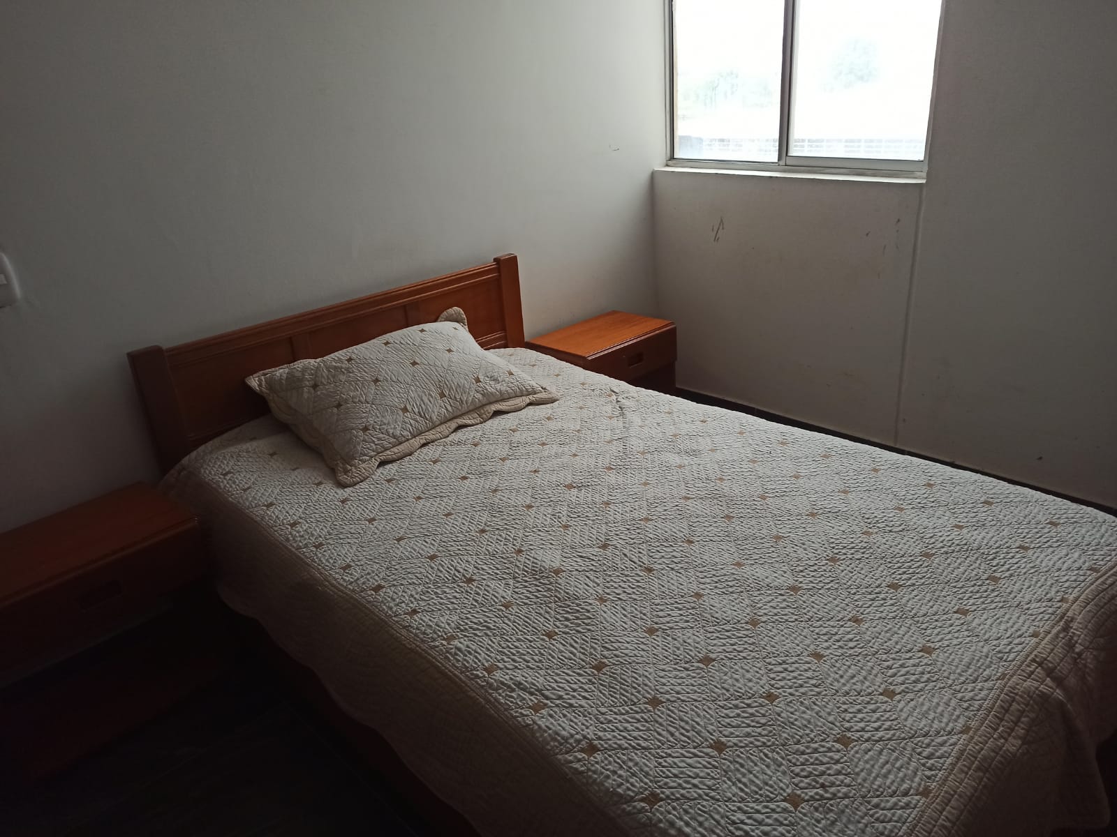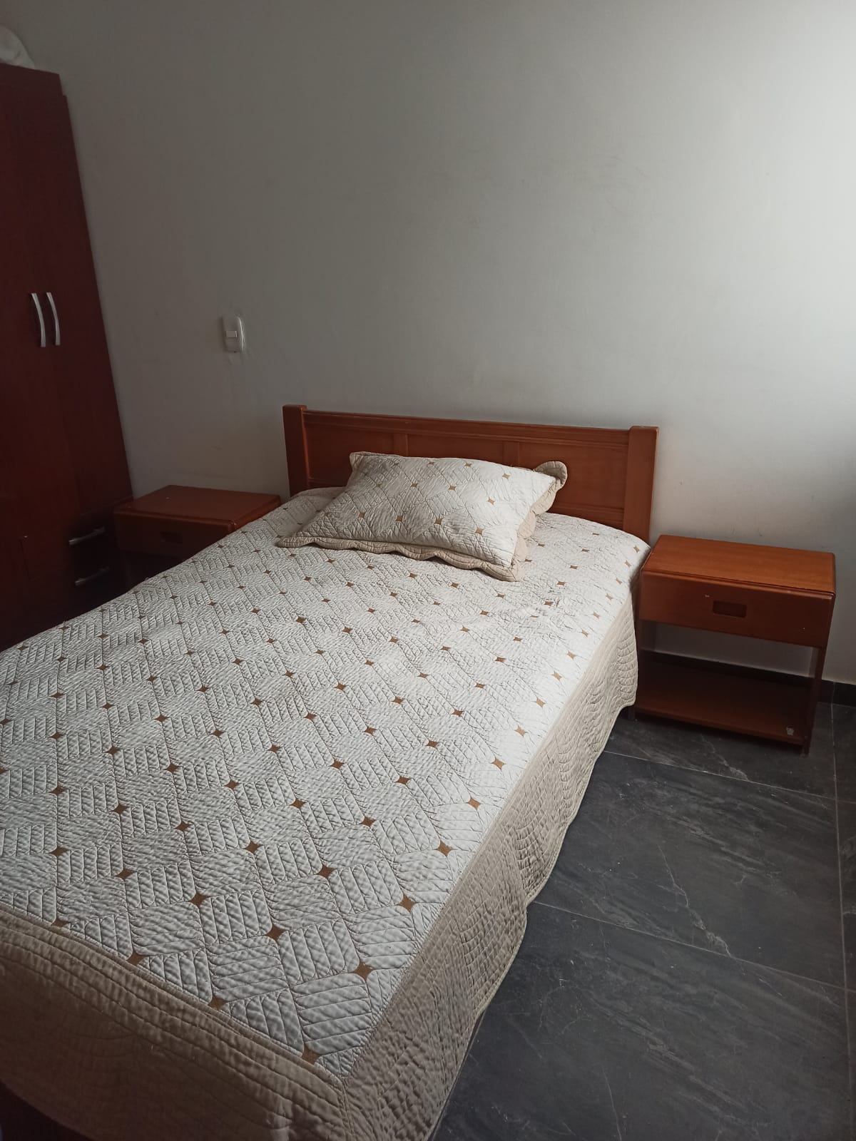 Cama semidoble, en madera color café oscuro con espaldar con diseño, cuenta con tablas en buen estado y con el juego de alcoba de dos mesitas de noche. Se entrega con colchón de firmeza media color blanco en buenas condiciones.