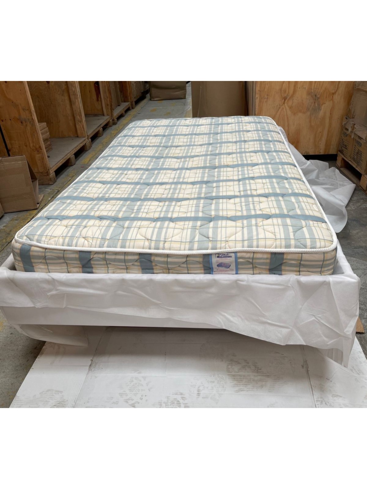 Cama sencilla base en color blanco con colchón de muy buena calidad.