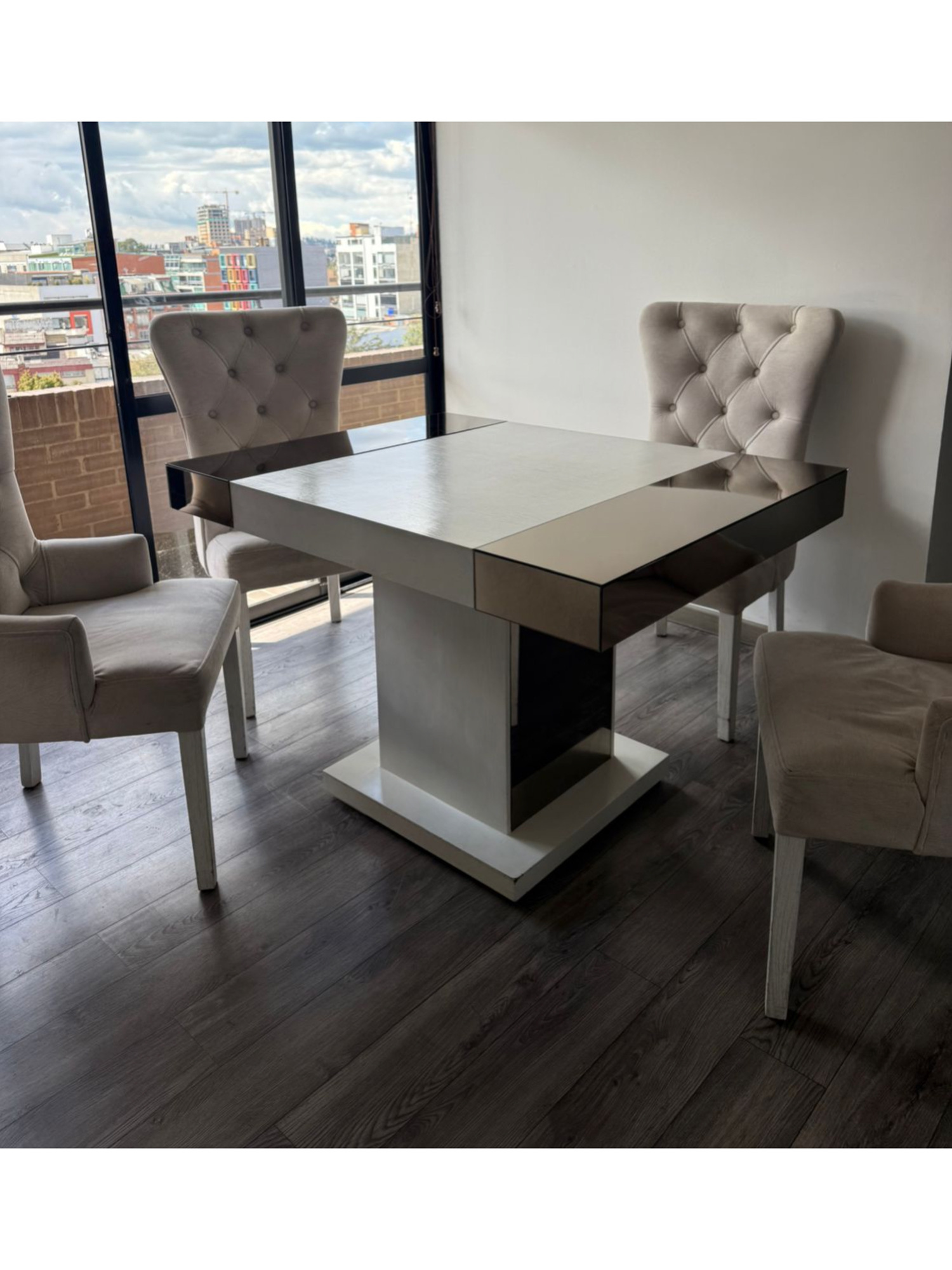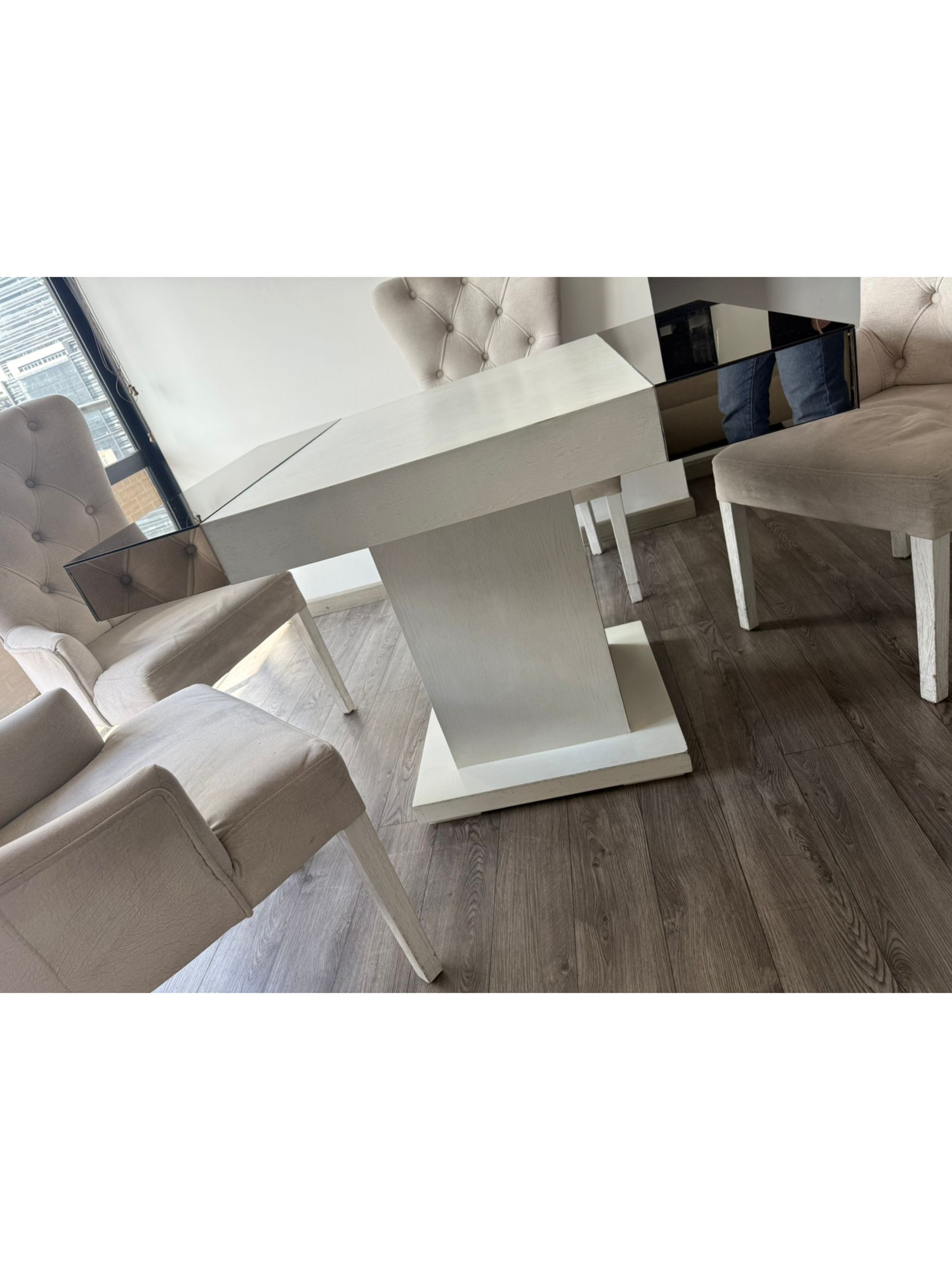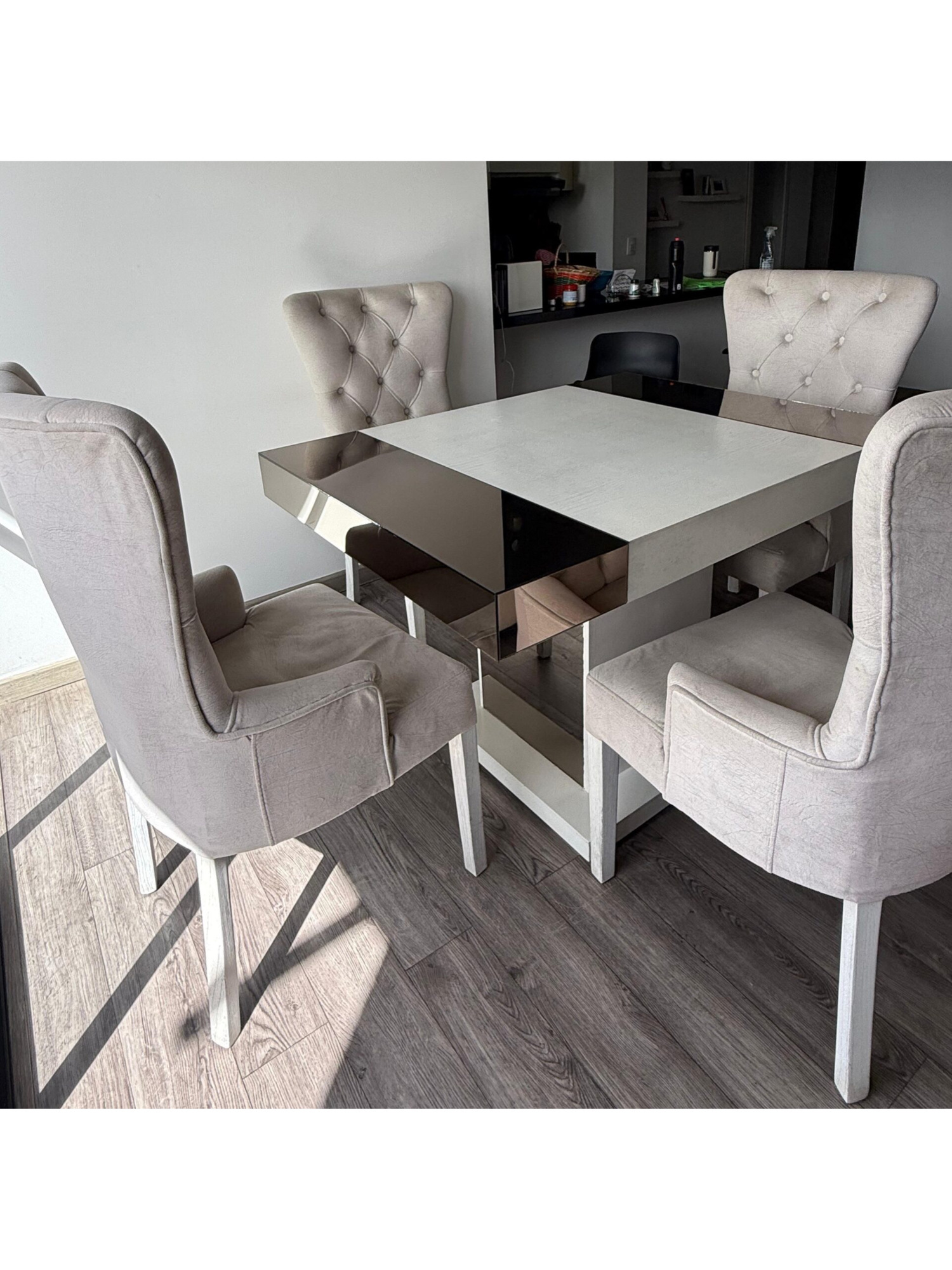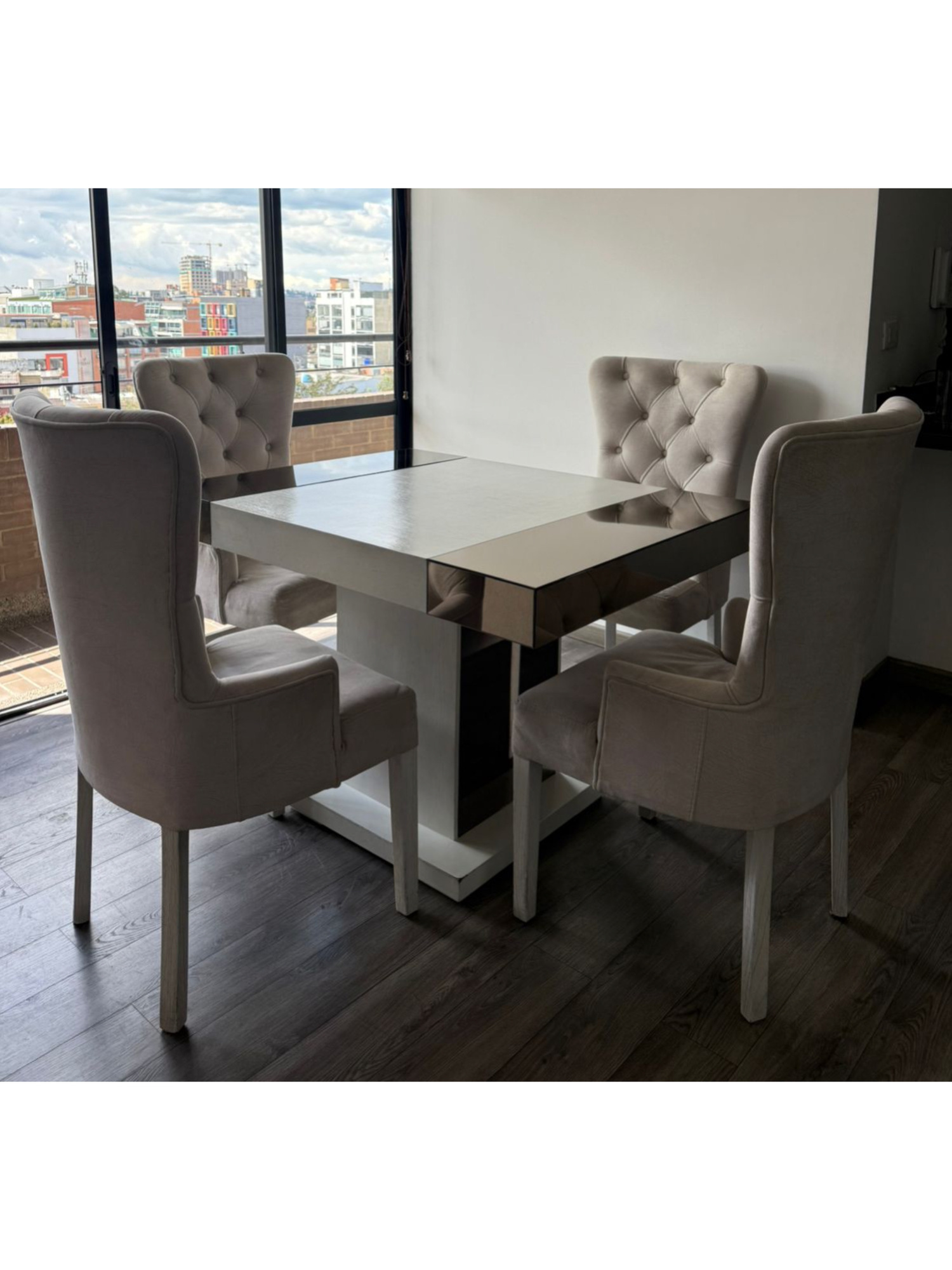 Comedor usado en muy buen estado, 4 sillas con tela amigable con mascotas, mesa con espejo palo de rosa muy sutil en base y lados de la mesa.