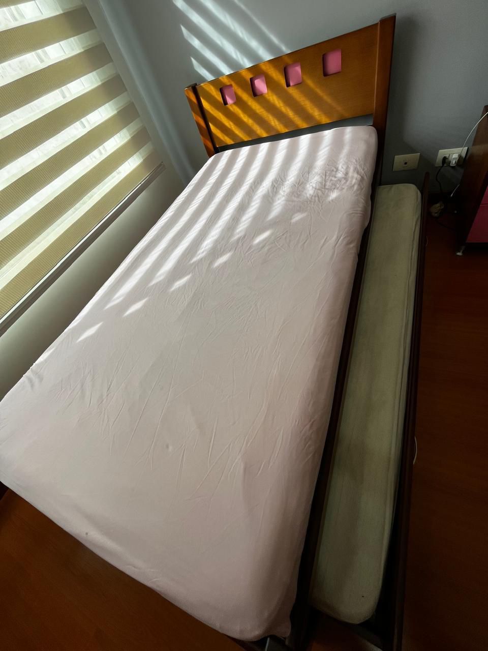 • Cama sencilla (sin colchón) con nido y colchoneta, mesa de noche y mueble organizador.