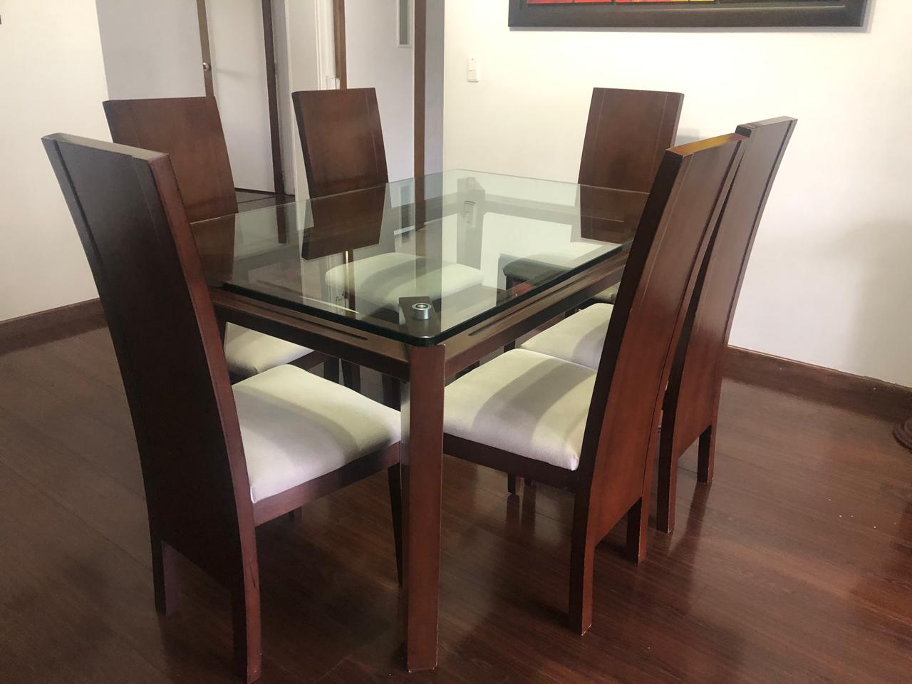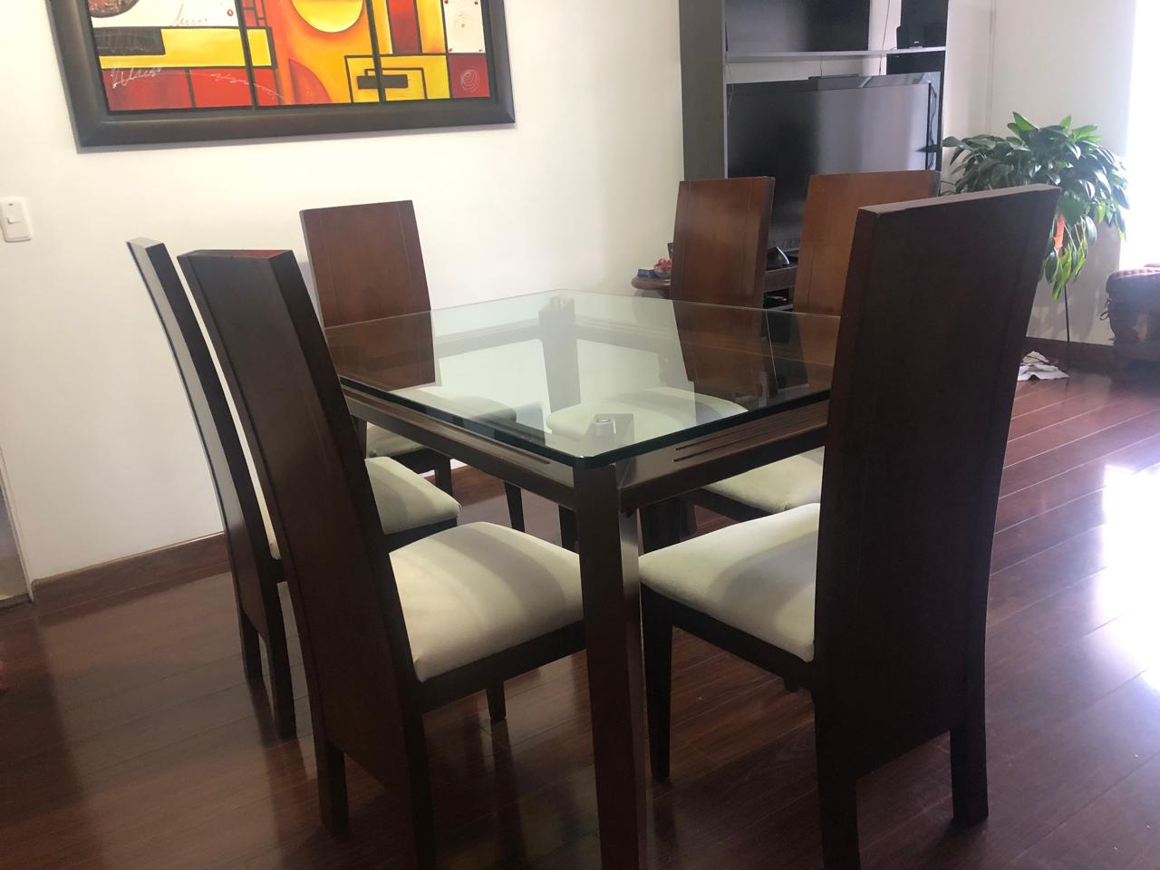 La mesa es de vidrio templado con base en madera sólida, estable y fácil de limpiar. Incluye 6 sillas en madera con tapizado color beige, cómodas y bien conservadas.