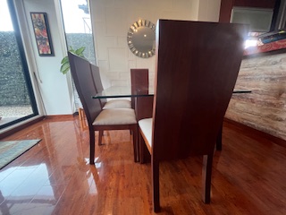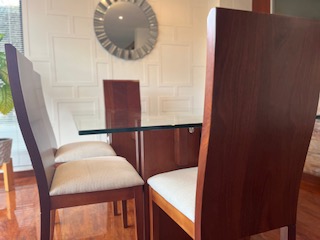 Juego de comedor con 6 sillas tapizadas en tela beige. Tapa en vidrio de seguridad de 15 mm.