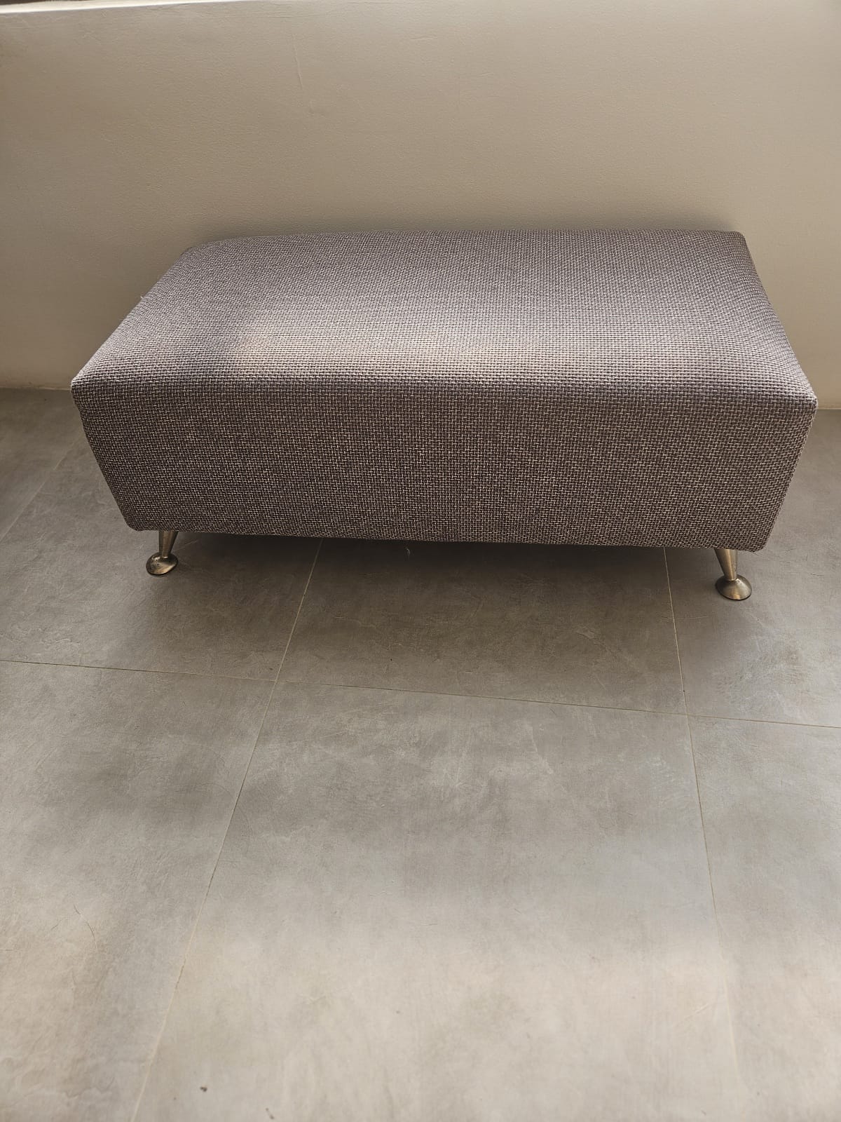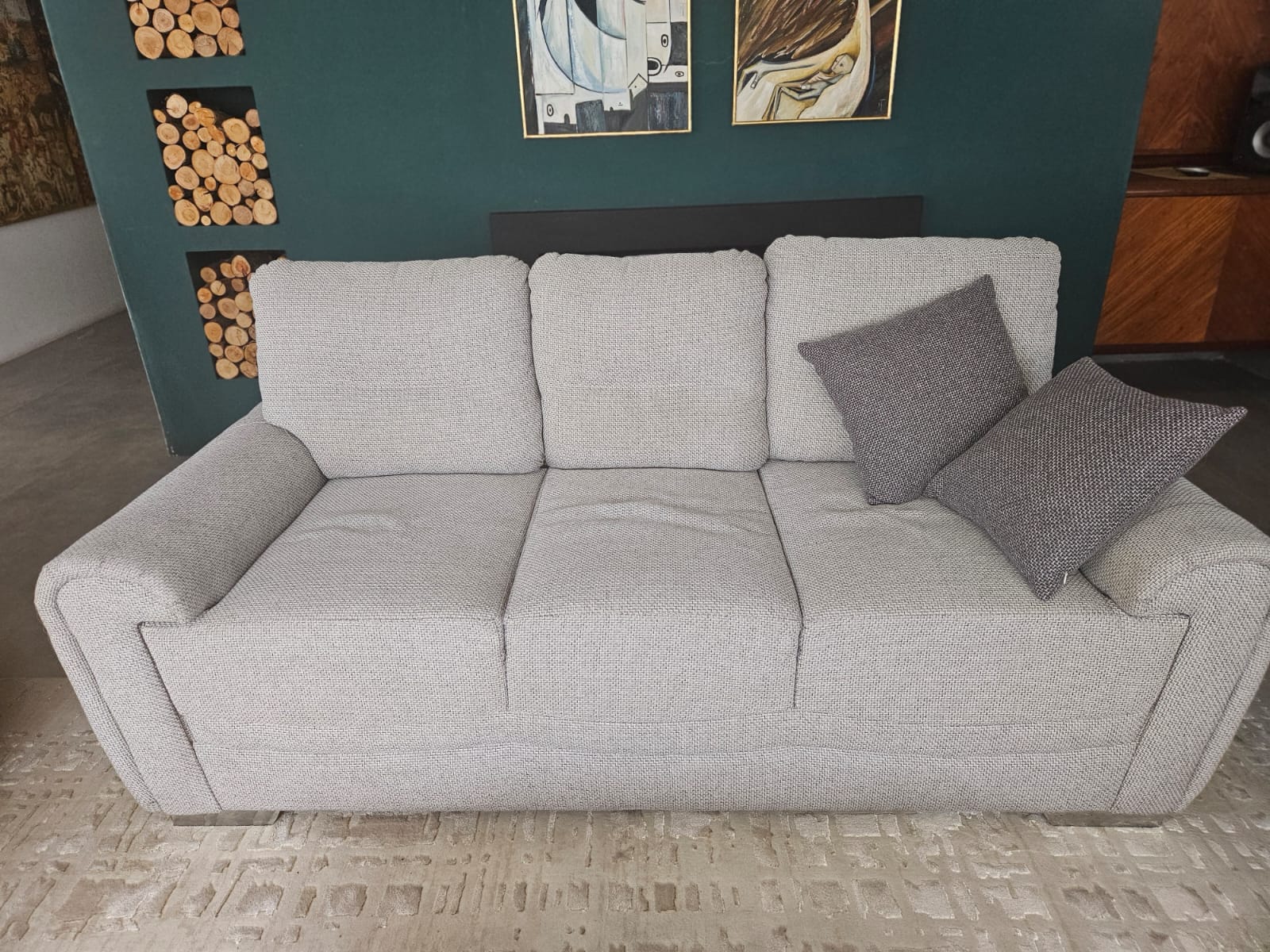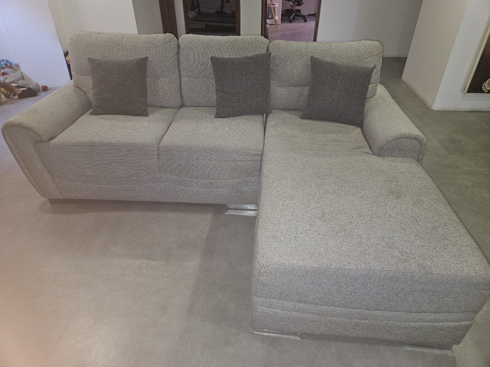 Es un juego de sala en lona gris claro. Incluye un sofa en L, un sofa de 3 puestos, un puff, mesa de centro y 6 cojines. Medidas de los muebles