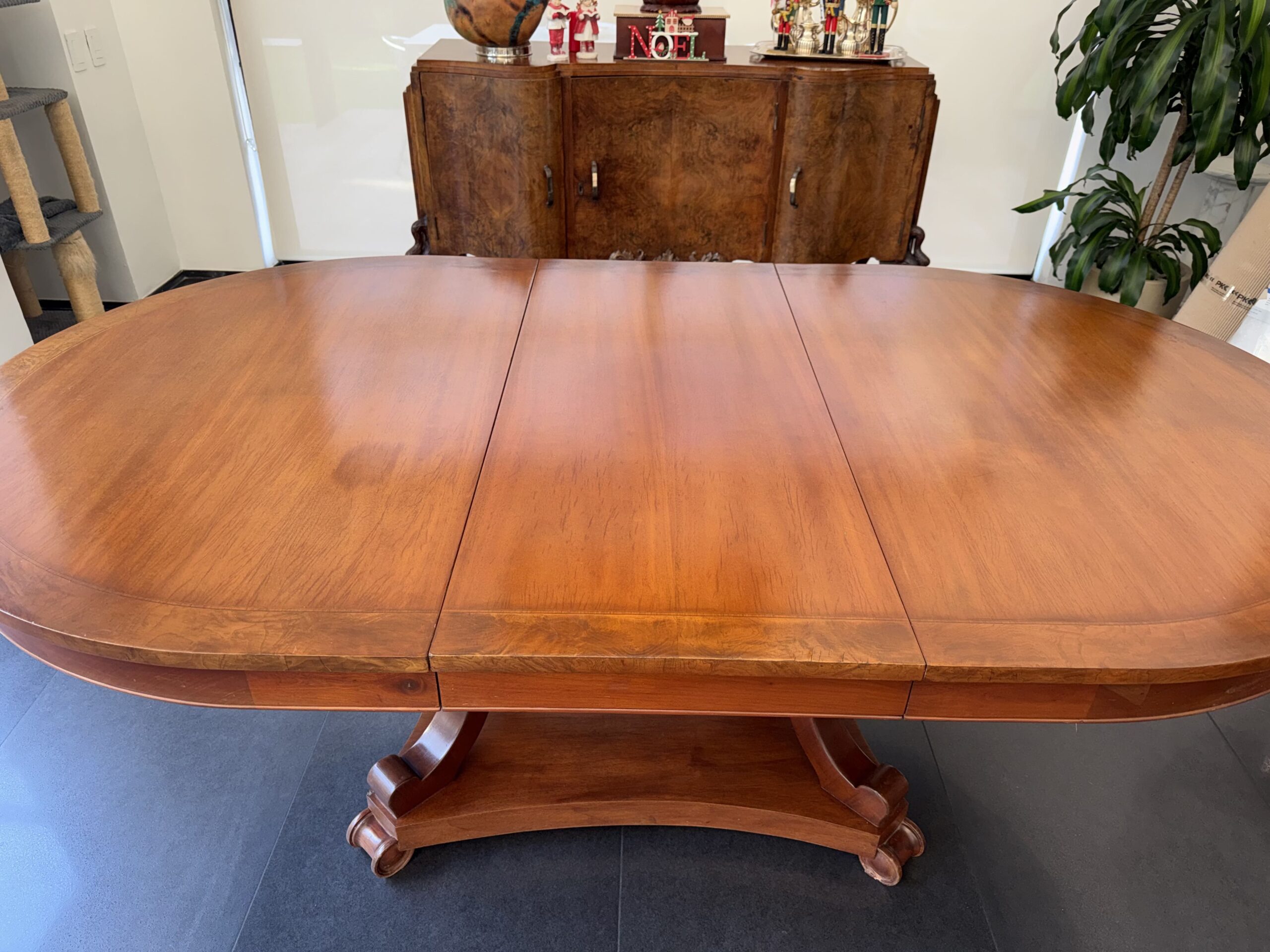 La mesa corresponde a un estilo clásico tradicional. Presenta un formato ovalado extensible, visible por las uniones longitudinales en el tablero, lo que indica un sistema de hojas centrales.