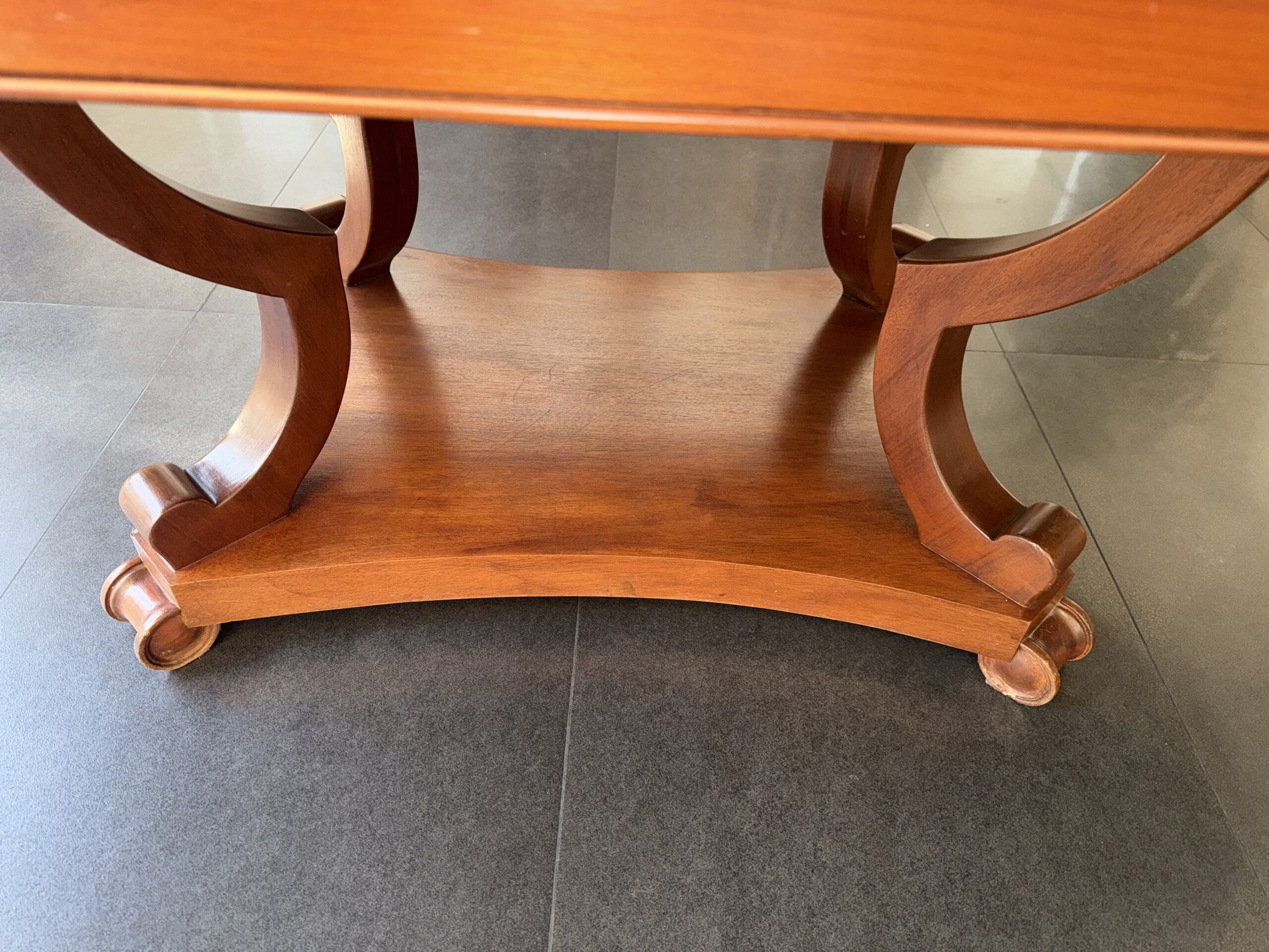 La base es central, con dos soportes curvos simétricos que se apoyan sobre una plataforma inferior continua. Los apoyos terminan en volutas talladas, integradas estructuralmente a la base.