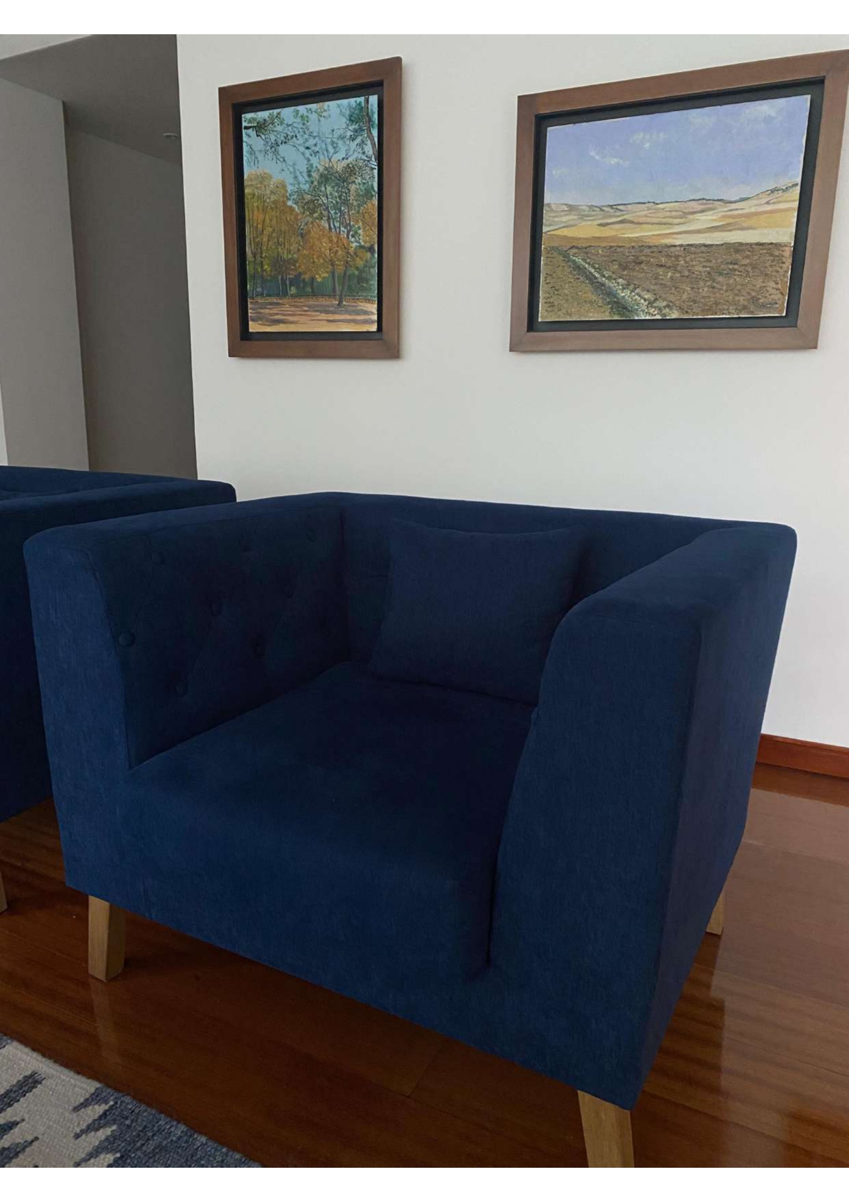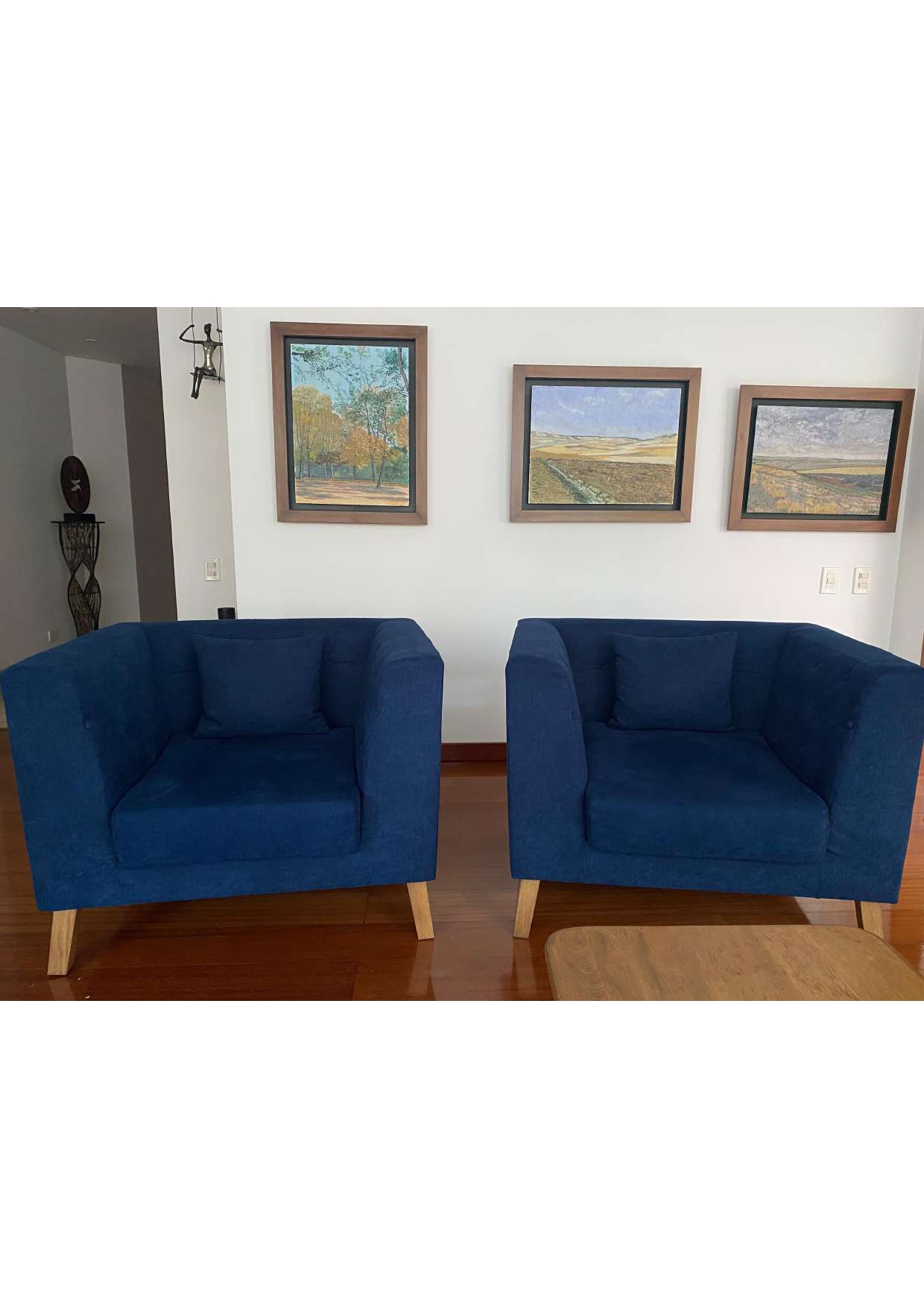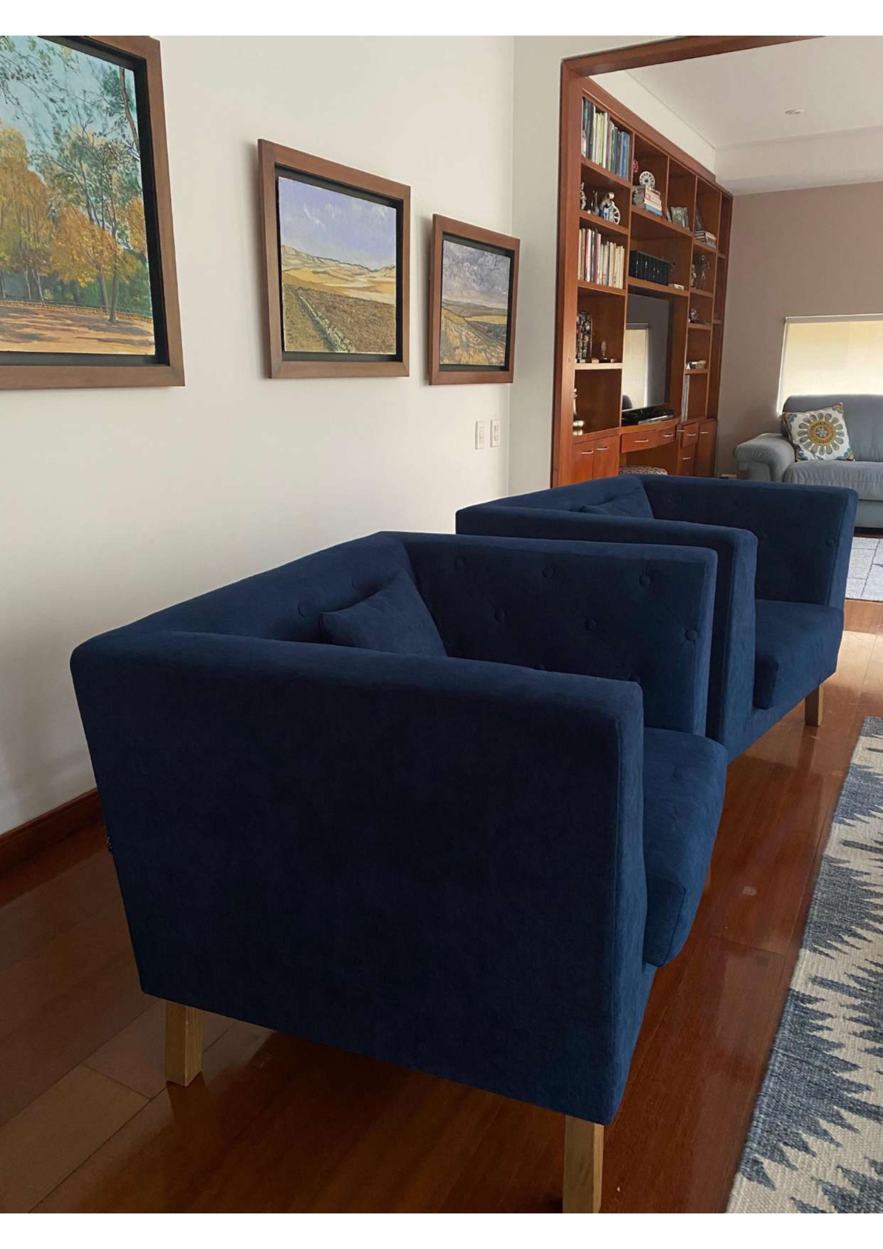 Par de poltronas tapizadas en tela azul con estructura cúbica y respaldo envolvente. Cada una incluye un cojín adicional del mismo material y tono. Las patas son de madera clara con acabado natural y forma ligeramente inclinada. El diseño presenta líneas rectas, asiento amplio y apoyabrazos a la misma altura del respaldo, lo que genera una silueta uniforme y compacta. Adecuadas para sala o área de descanso.