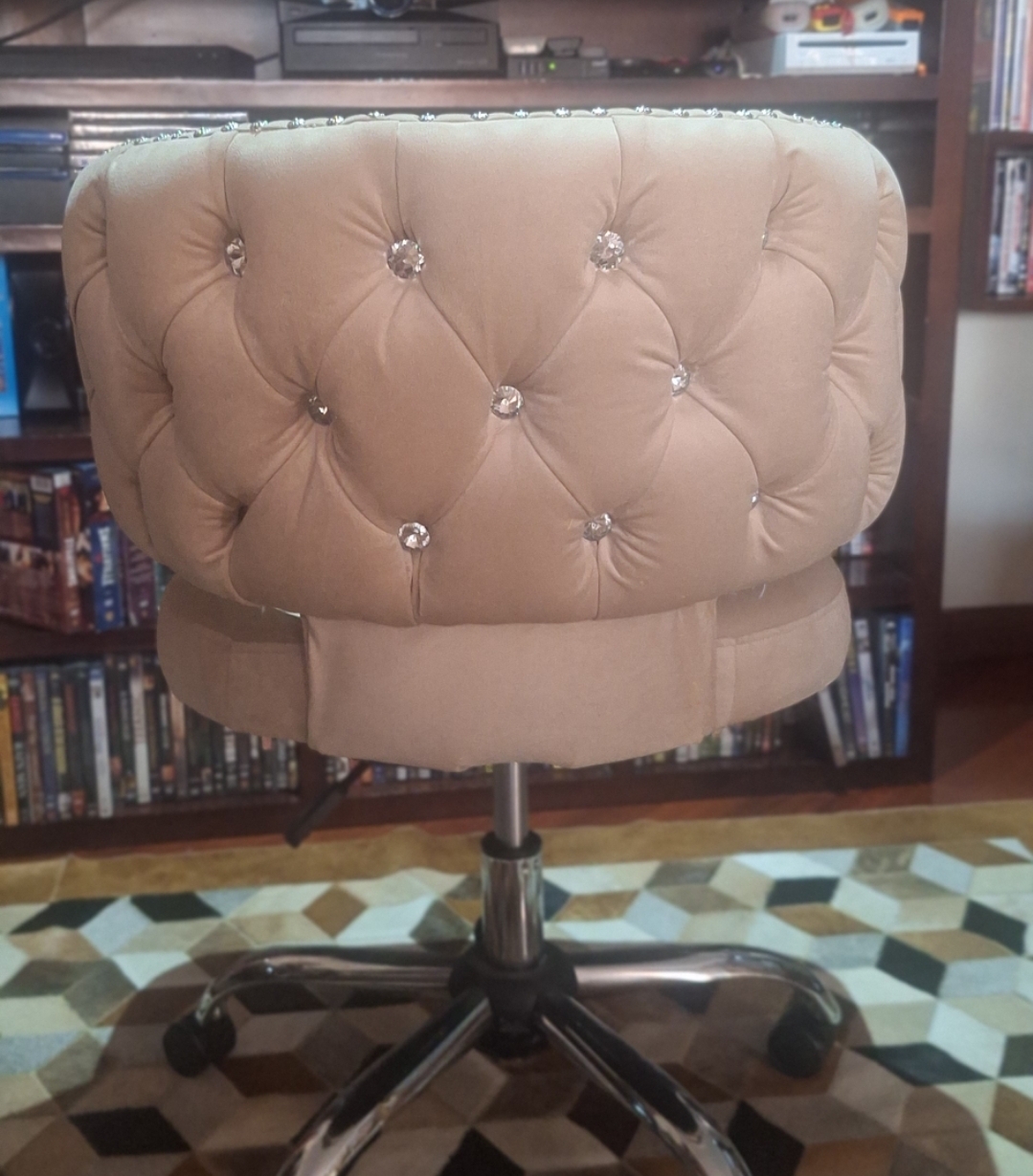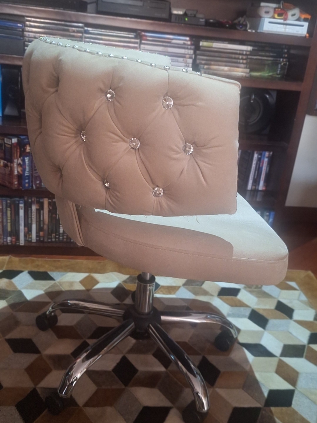 Silla para escritorio estilo Glam o Hollywood Regency, un estilo conocido por combinar elegancia, brillo y detalles llamativos. Esto se evidencia en el tapizado capitonado del espaldar, donde los botones tipo cristal crean un efecto sofisticado y decorativo.