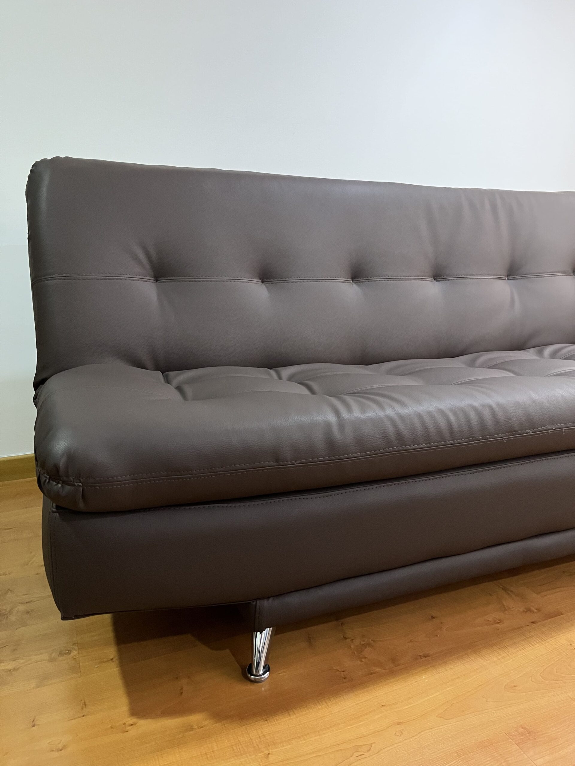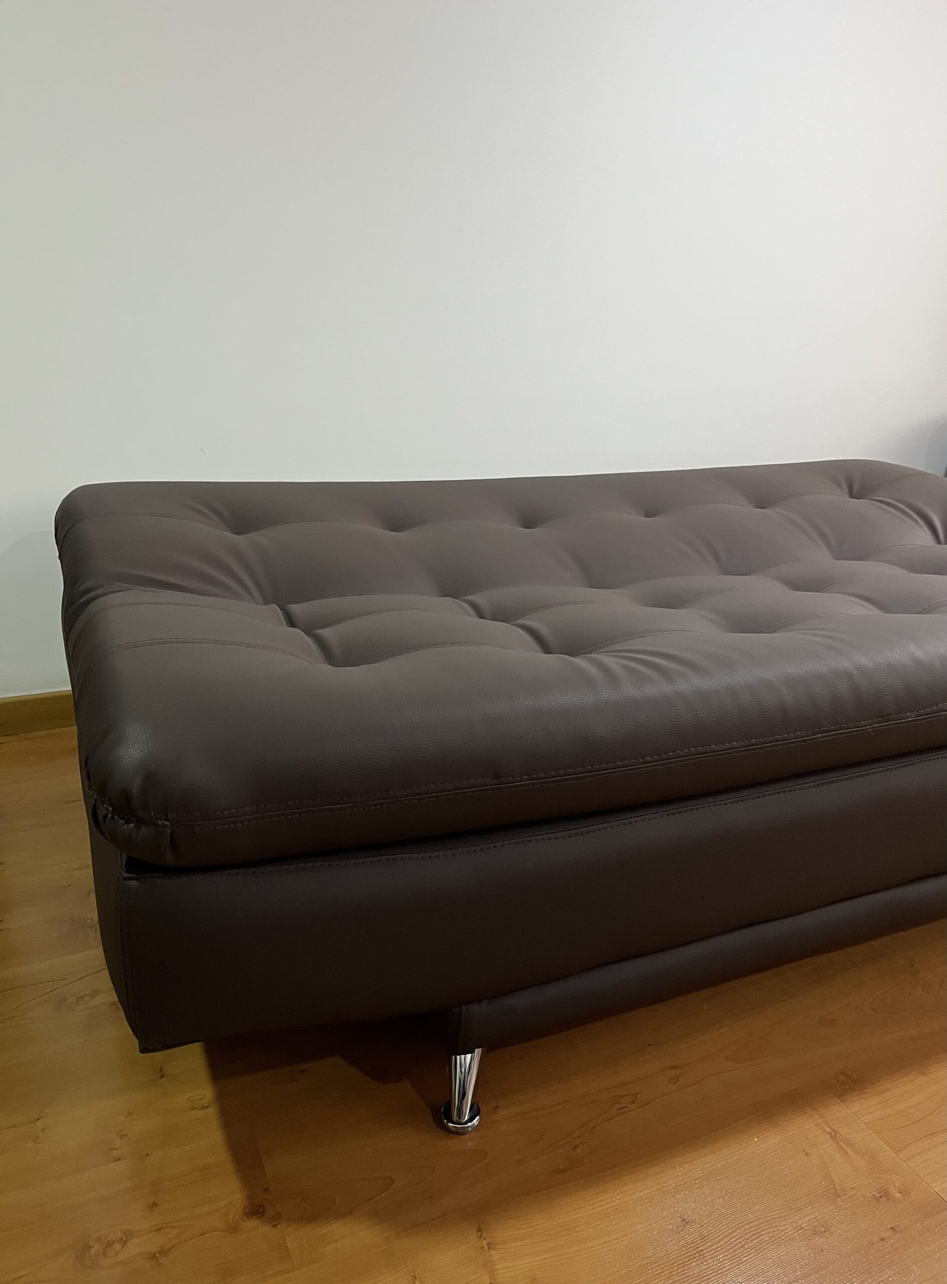 Sofá cama en color marrón, ideal para espacios prácticos y funcionales. Abierto, tiene unas medidas de 1,20 x 1,80 metros, ofreciendo espacio cómodo para dos personas.Se encuentra en excelente estado, ya que fue retapizado hace 2 años, por lo que el material está completamente intacto, sin rasguños, raspados ni ningún tipo de daño. Es una opción perfecta si buscas un sofá cama moderno, funcional y bien conservado.