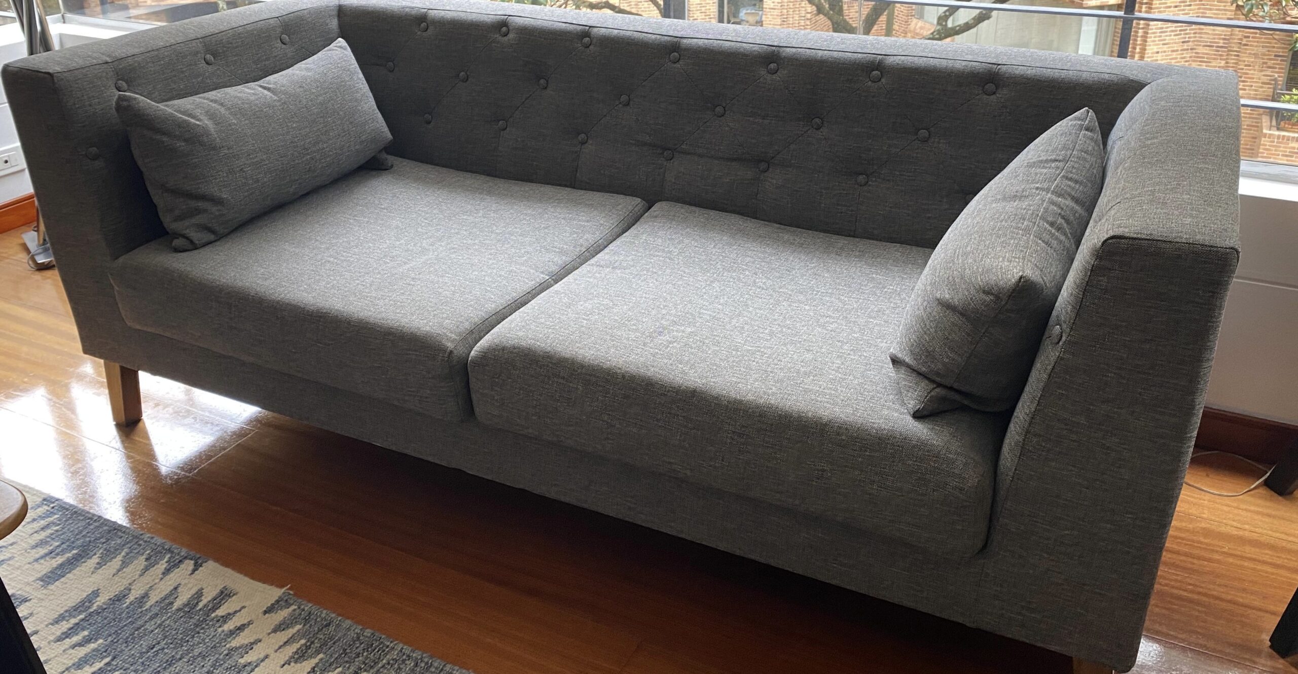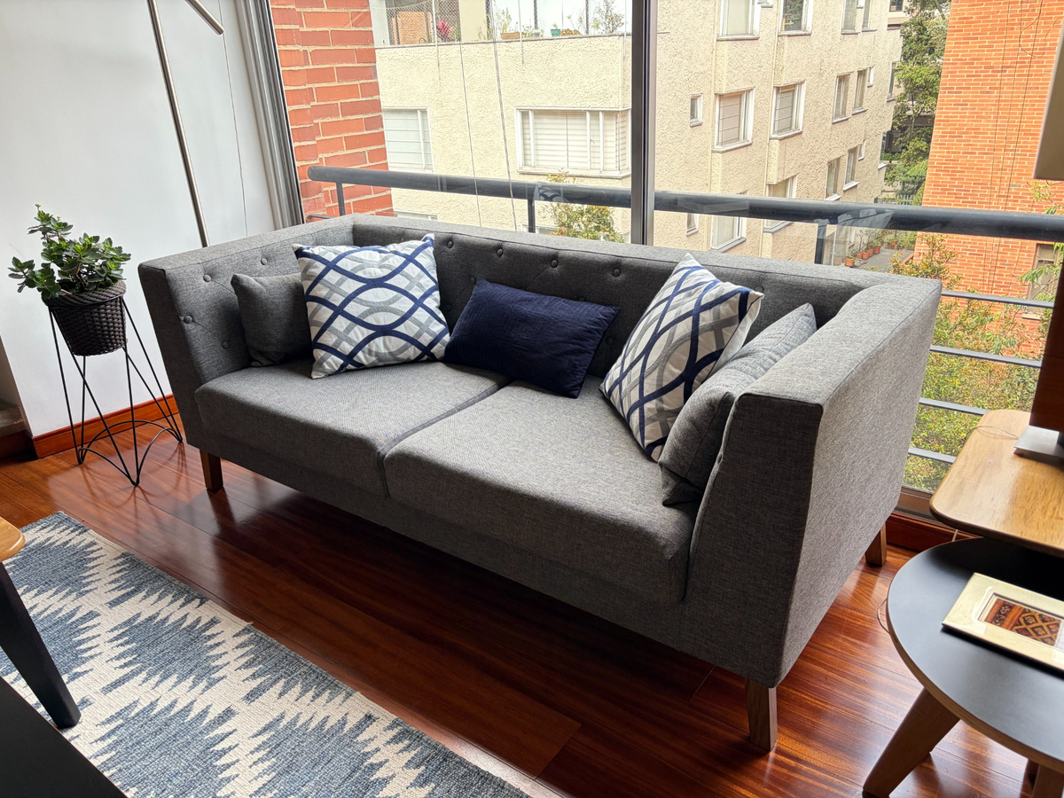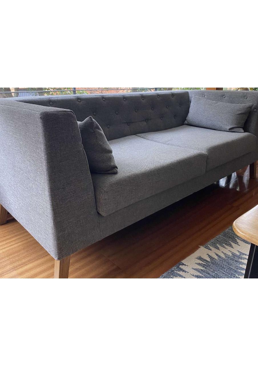 Sofá de 3 puestos tapizado en color gris y base en pintura roble natural con cojines.