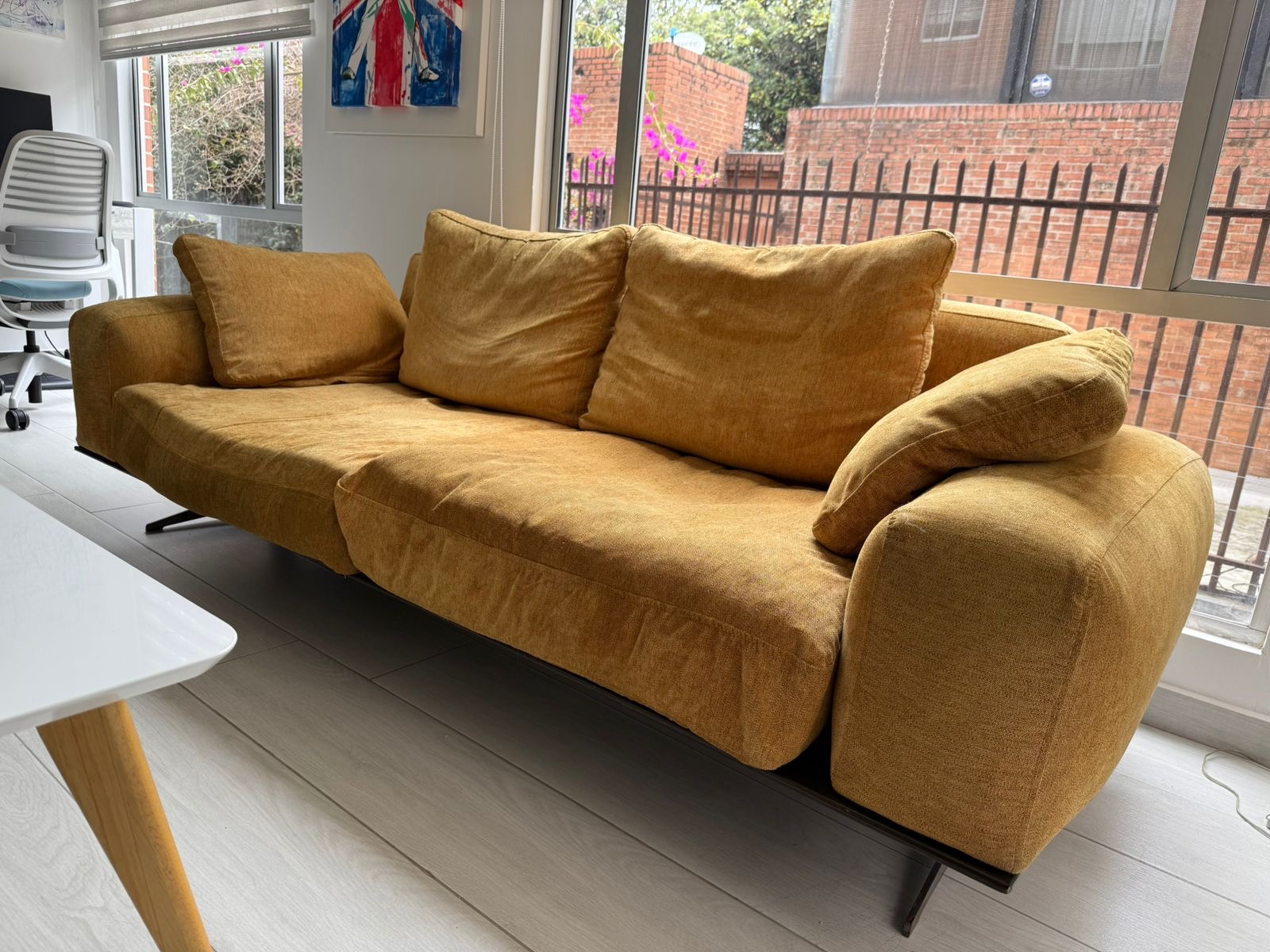 Sofa de 3 puestos, tapizado en color mostaza de la marca muebles y accesorios, colección 2020, tela especial para mascotas.