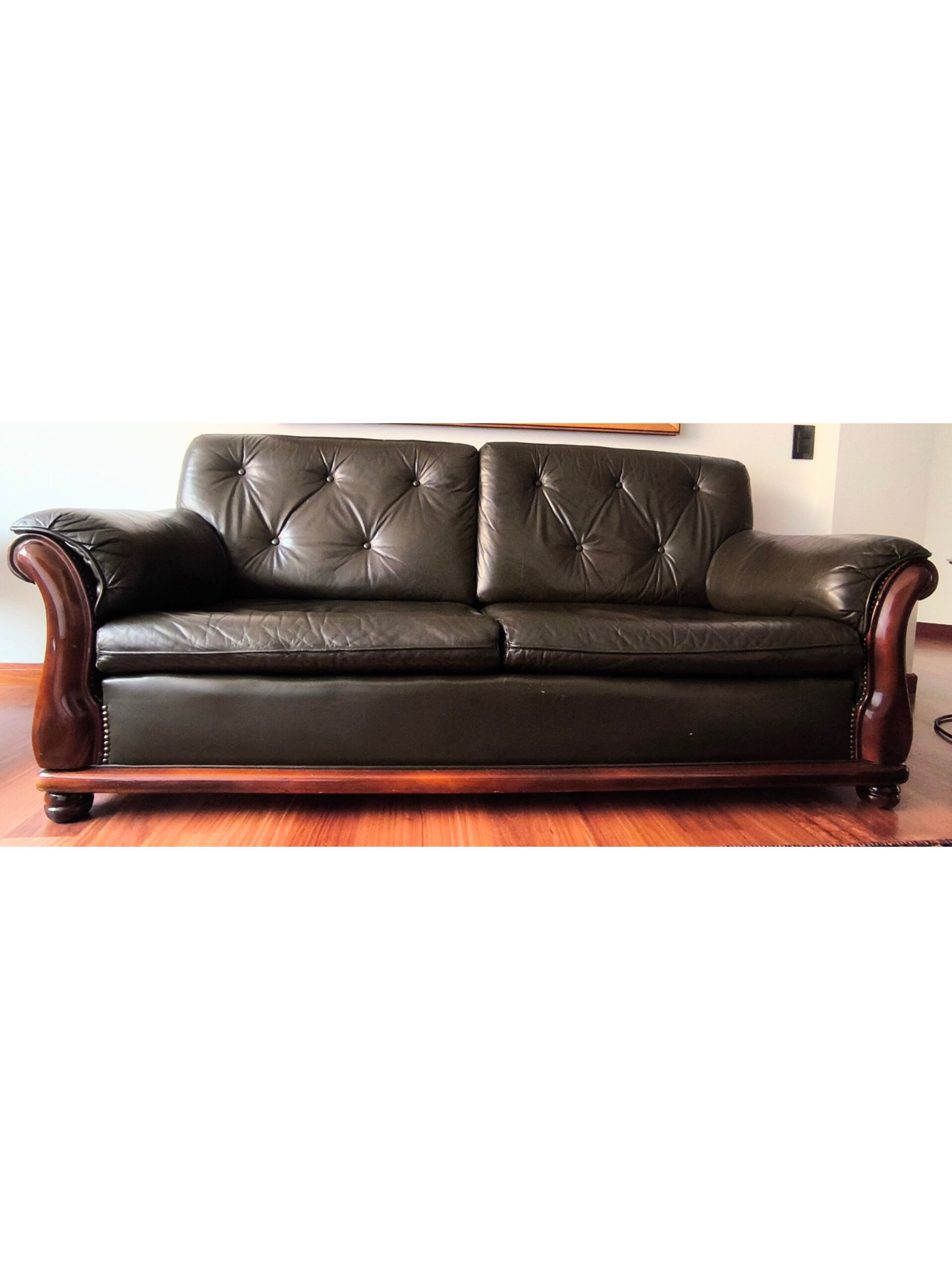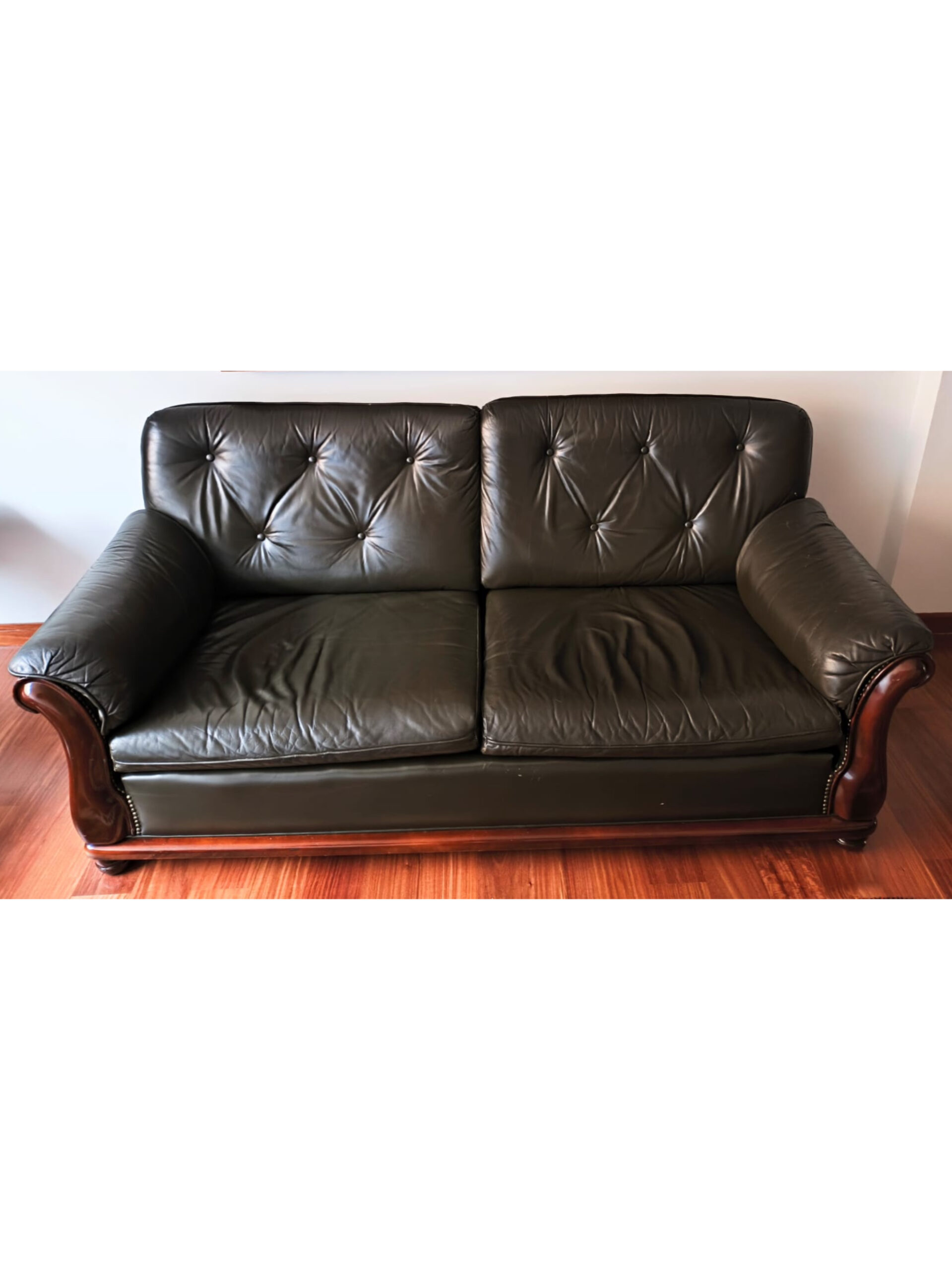 Sofá de 2 puestos estilo clásico inglés, tapizado en cuero genuino color verde oscuro.