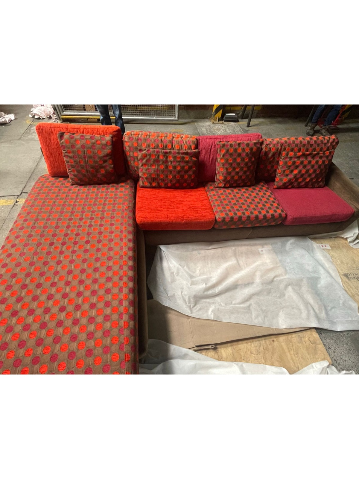 Sofá en L de 4 puestos color café, rojo y naranja.